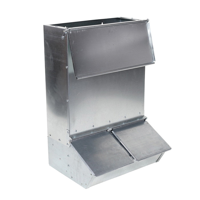Hog supplement feeders are constructed of heavy 20 gauge galvanized steel for years of service. They have an adjustable feed gate at trough with fast feed flow and a 1 in W (2.54 cm) feed saver lip. The 11H feeder handles 4 week old pigs to sows. Top covers raise from back for easy filling without disturbing the hogs. This hog feeder is heavy weather tight trough lids keep out moisture and pests.