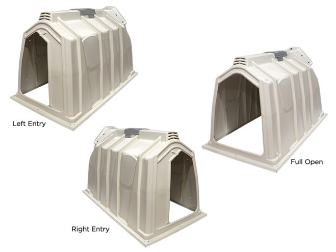The open front coupled with fully adjustable rear ventilation allow for optimal airflow that can be adjusted based on climate and weather changes. A one-of-a-kind rear-bedding door makes replacing bedding and cleaning fast, simple, and safe. An optional inside feed station can be installed for additional flexibility.