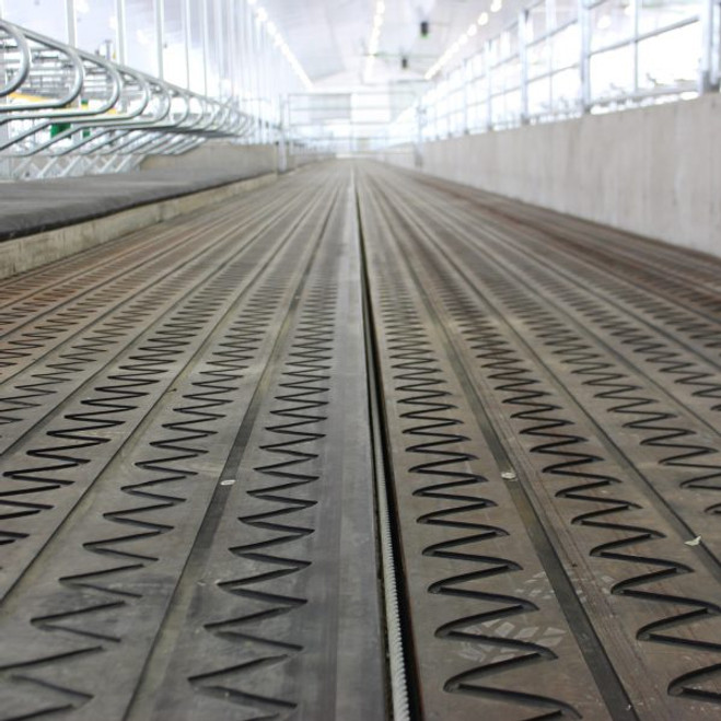 Our grooved roll walkways are renowned for extreme durability and are perfect for areas with high traffic. The grooved roll includes a 5mm stainless steel cable inlay, guaranteed to never stretch. A grooved top layer ensures excellent traction while still protecting your dairy cows’ hooves.