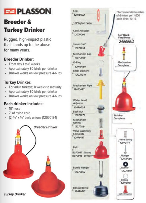 Each breeder drinker is self-cleaning and will operate on low water pressure. Includes a 10' hose and barbs. Additional drinker parts are also available.