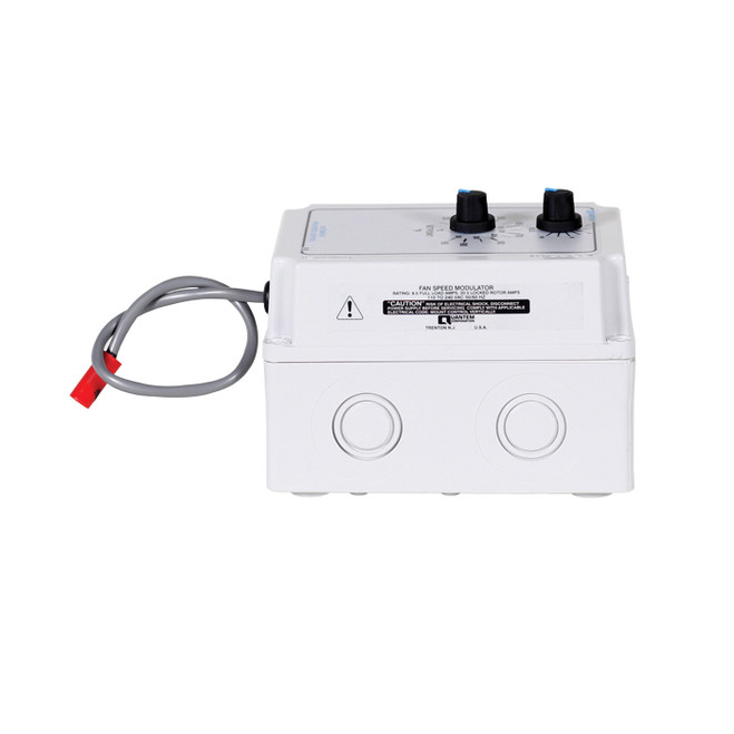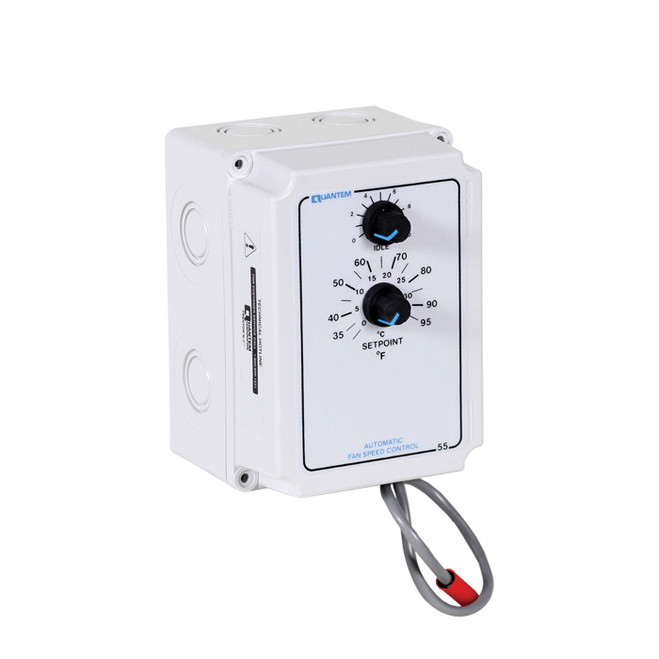 Precisely modulate the speed of ventilation fans in response to changes in ambient temperature. Optimum air circulation is maintained in ventilated areas and buildings with minimum noise and efficient use of energy. A thermistor monitors the air temperature and, as the temperature rises or falls within a preset band above set point, the fan speed is correspondingly increased or reduced between maximum and minimum idle speed values. The idle adjustment control setting includes a "zero-power FAN STOP" position at which fan speed is stopped when ambient temperature is below setpoint. This "zero-power FAN STOP" function will be over ridden by temperature control functionality meaning that power will be applied to the fan when the ambient temperature exceeds setpoint. Modulating band above set point, between the maximum and minimum speeds, is fixed at 6 deg. Temperature set point is adjustable from 35 to 95 deg F. Especially designed for agricultural buildings, although of broad application in all ventilated areas, these fan controls are compact units designed to fit on a standard 4x4 junction box. Construction protects the electronic controls against dust and solid state design ensures long life and reliable operation. Fan speed motors must be permanent split capacitance or shaded pole with built-in thermal fuse. Load must decrease as RPM increases and bearings should be capable of operating at minimum RPM for phase angle speed control.