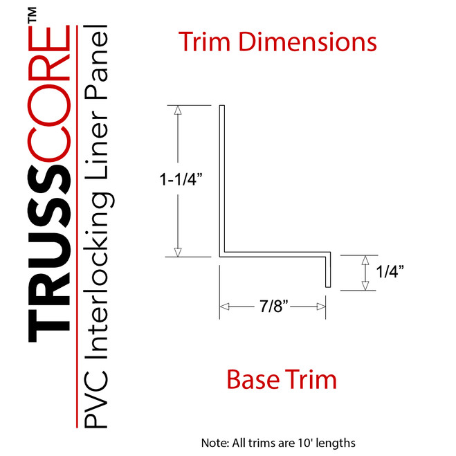 The Trusscore® base trim, measuring 10’ long, is made from high-quality PVC, known for its durability and ease of maintenance. Its 1-¼” height makes it suitable for various panel thicknesses, providing a snug fit and seamless appearance.
